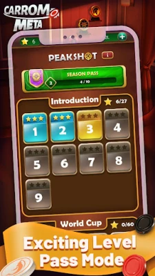 Ngoài những chế độ cổ điển, Carrom Meta còn thử thách kỹ năng của bạn với "Peak Shot" – một cuộc phiêu lưu ly kỳ, nơi bạn phải đưa quân bi vàng vào mục tiêu qua từng cấp độ. Mỗi mùa chơi được thiết kế công phu với chủ đề riêng, và mỗi chương mang một câu chuyện độc đáo, yêu cầu sự chính xác cực độ và tư duy chiến lược. Dám thử thách bản thân và tranh tài với những người chơi hàng đầu? Carrom Meta mời gọi bạn chứng tỏ ai là cao thủ Carrom thực sự.